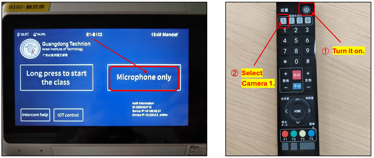This guide is designed to assist lecturers and students in effectively using the auxiliary camera system installed in large classrooms. The primary purpose of this system is to capture content written on the whiteboard and display it on an additional TV screen. This setup ensures that students seated at the back of the classroom have a clear view of the lecture materials, thus enhancing their learning experience. This document will provide step-by-step instructions on how to operate the camera and TV display so that all participants can fully engage with the educational content, regardless of their seating position in the classroom.